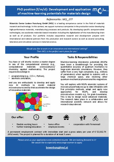 PhD position (f/m/d): Development and application of machine-learning potentials for materials design